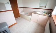 Generous bathroom with tiled floor. Coloured suite of toilet, inset wash hand basin with hot and cold taps and storage unit under. Bath with tiled surround. Separate shower enclosure with tiled walls, sliding shower doors and electric shower unit.
