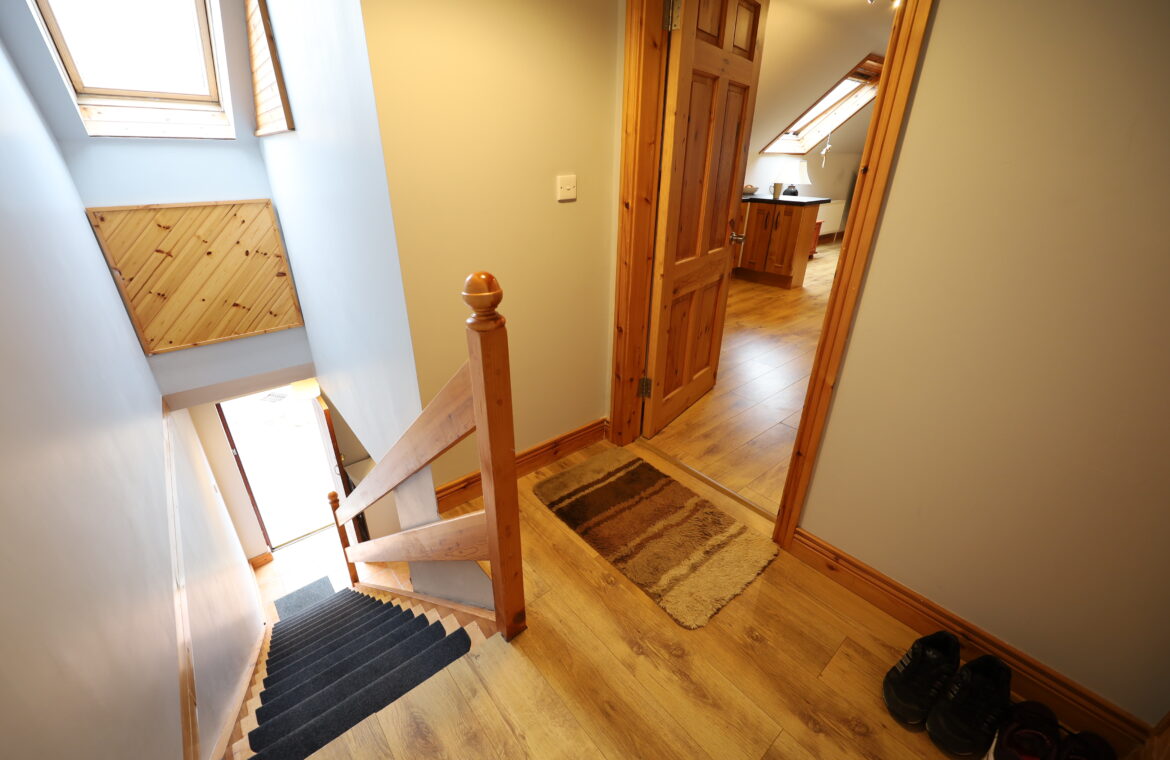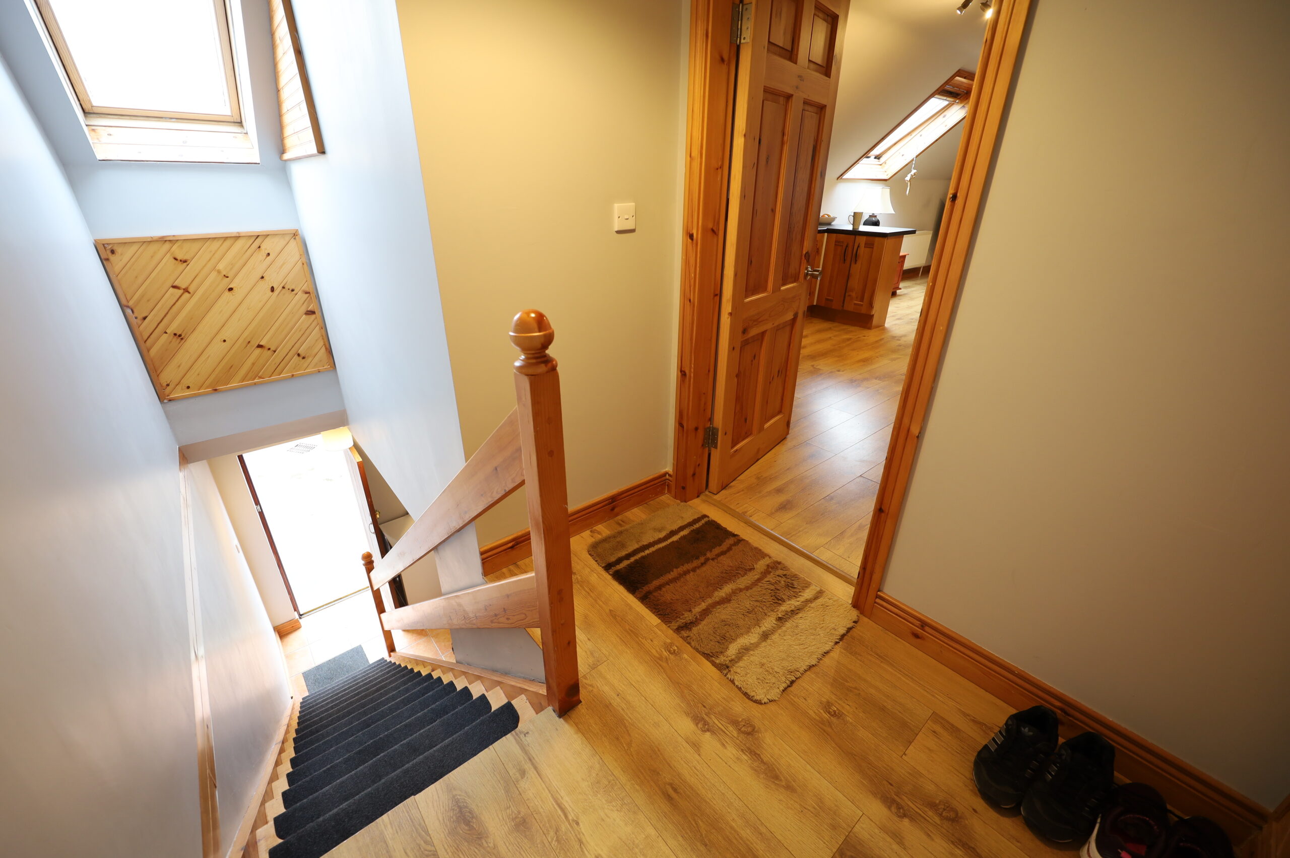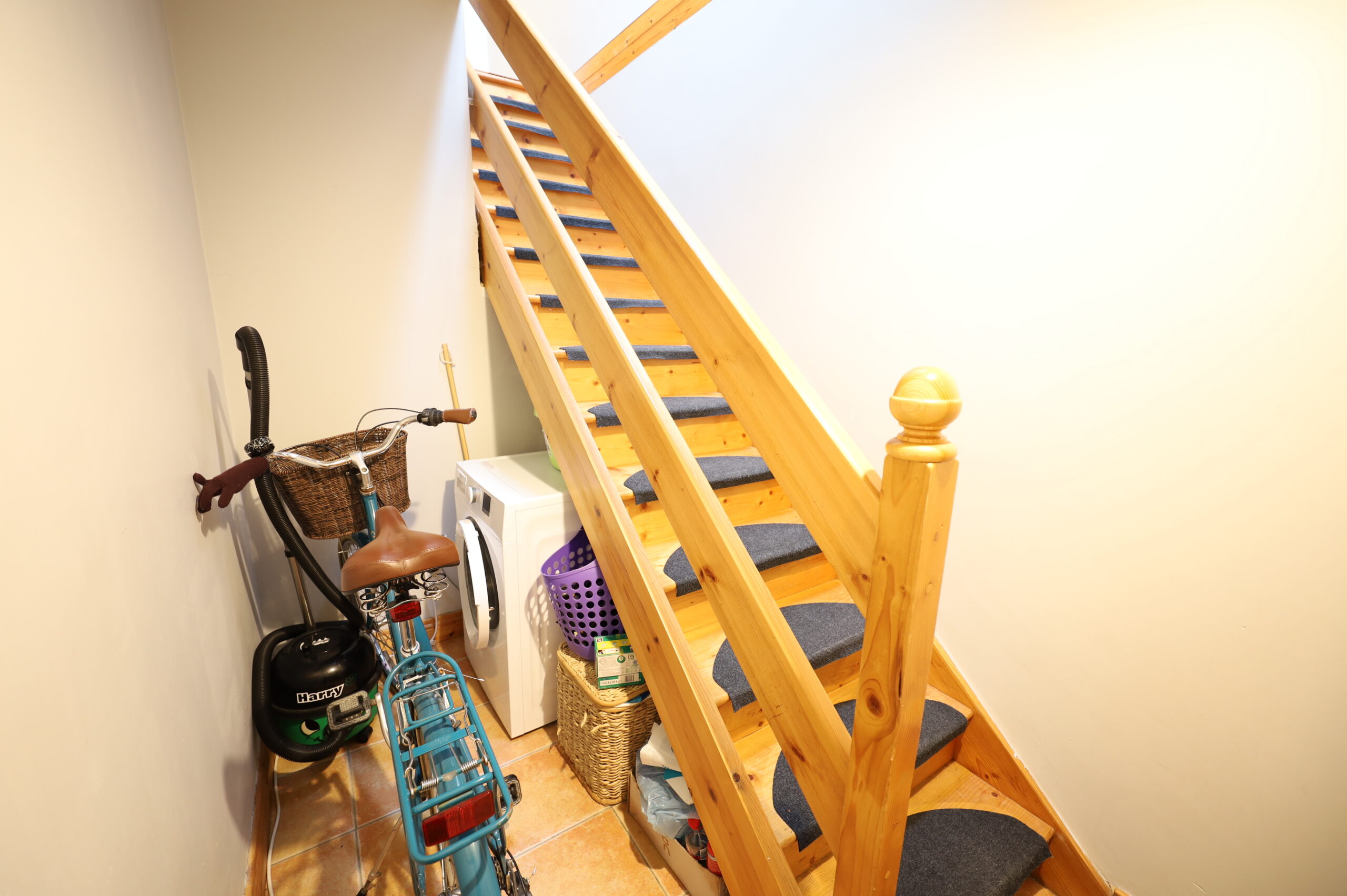 Sheeted door. Tiled floor. Attractive pine staircase to first floor studio. Washing machine under stairs area included.